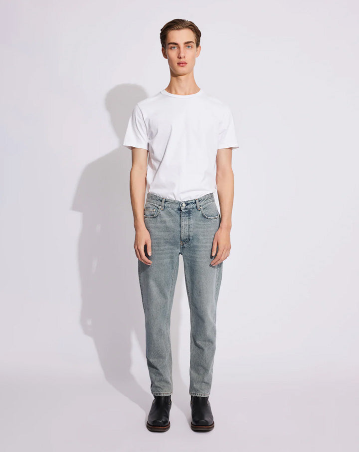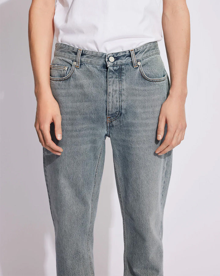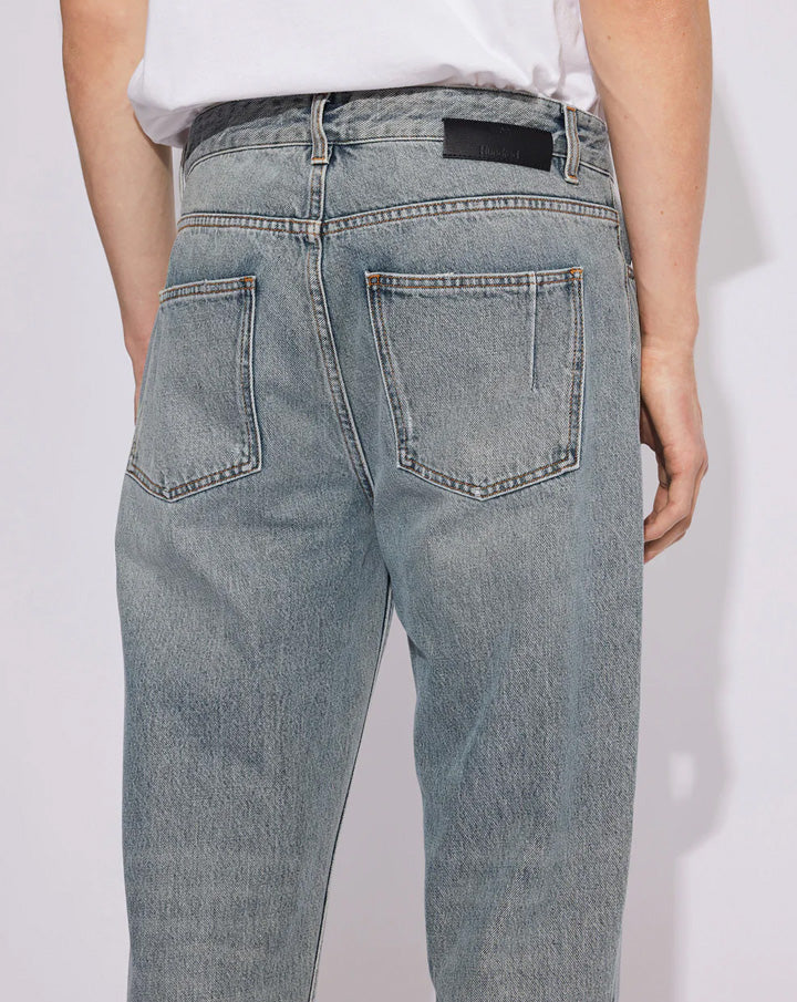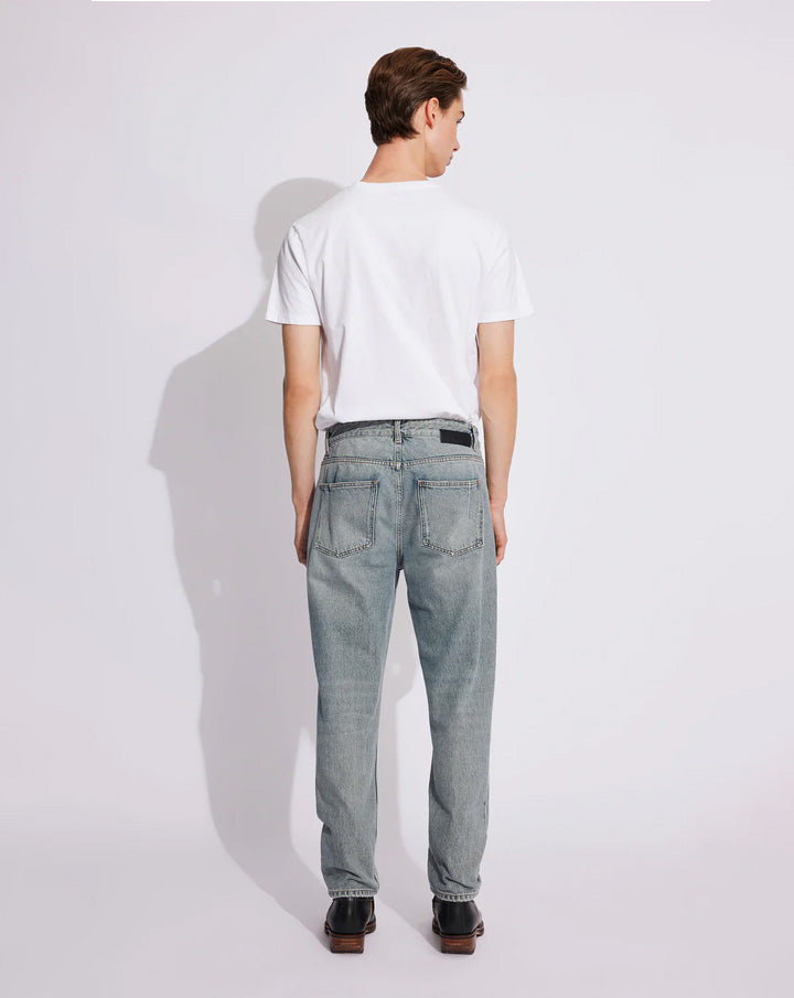 Ben is a pair of carrot-shaped jeans with a loose fit. The jeans have a mid-waist, button fly, and a cropped, tapered leg.